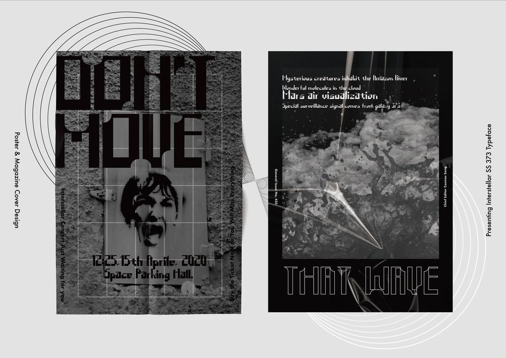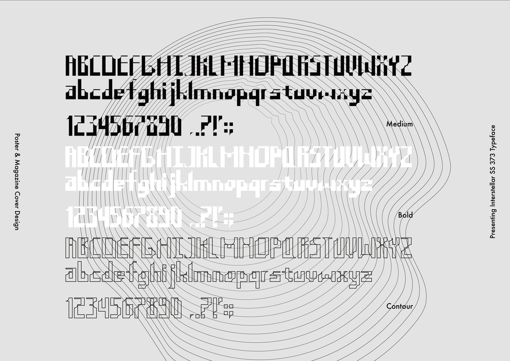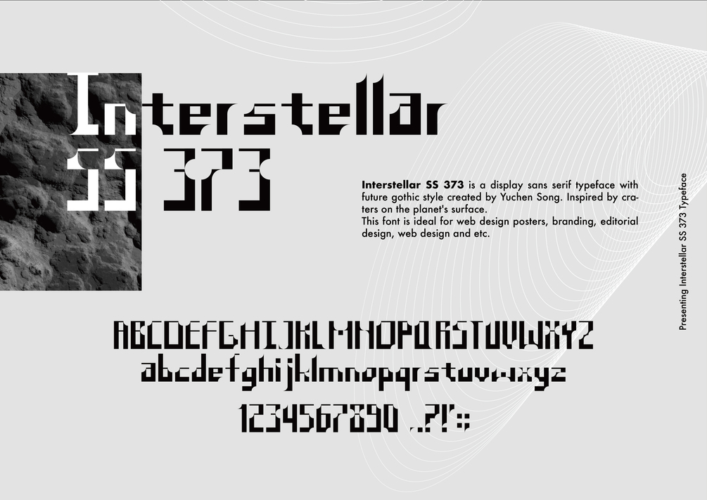 Interstellar SS 373 is a display sans serif typeface with future gothic style created by Yuchen Song. Inspired by craters on the planet's surface.